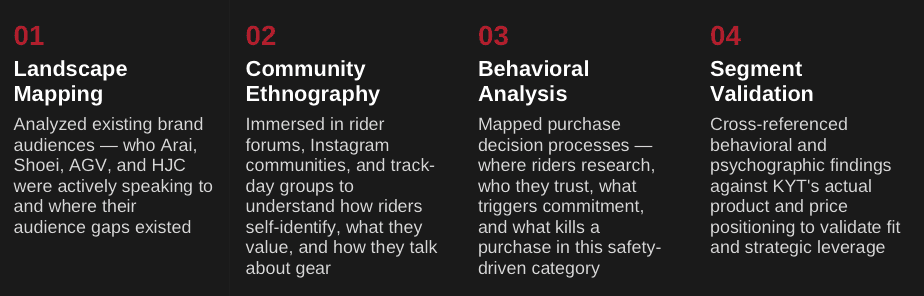 The methodology combined competitive landscape analysis, powersports industry data, community ethnography across rider forums and track-day ecosystems, and purchase behavior mapping to identify the audience segment with the highest strategic leverage for a challenger brand entry.