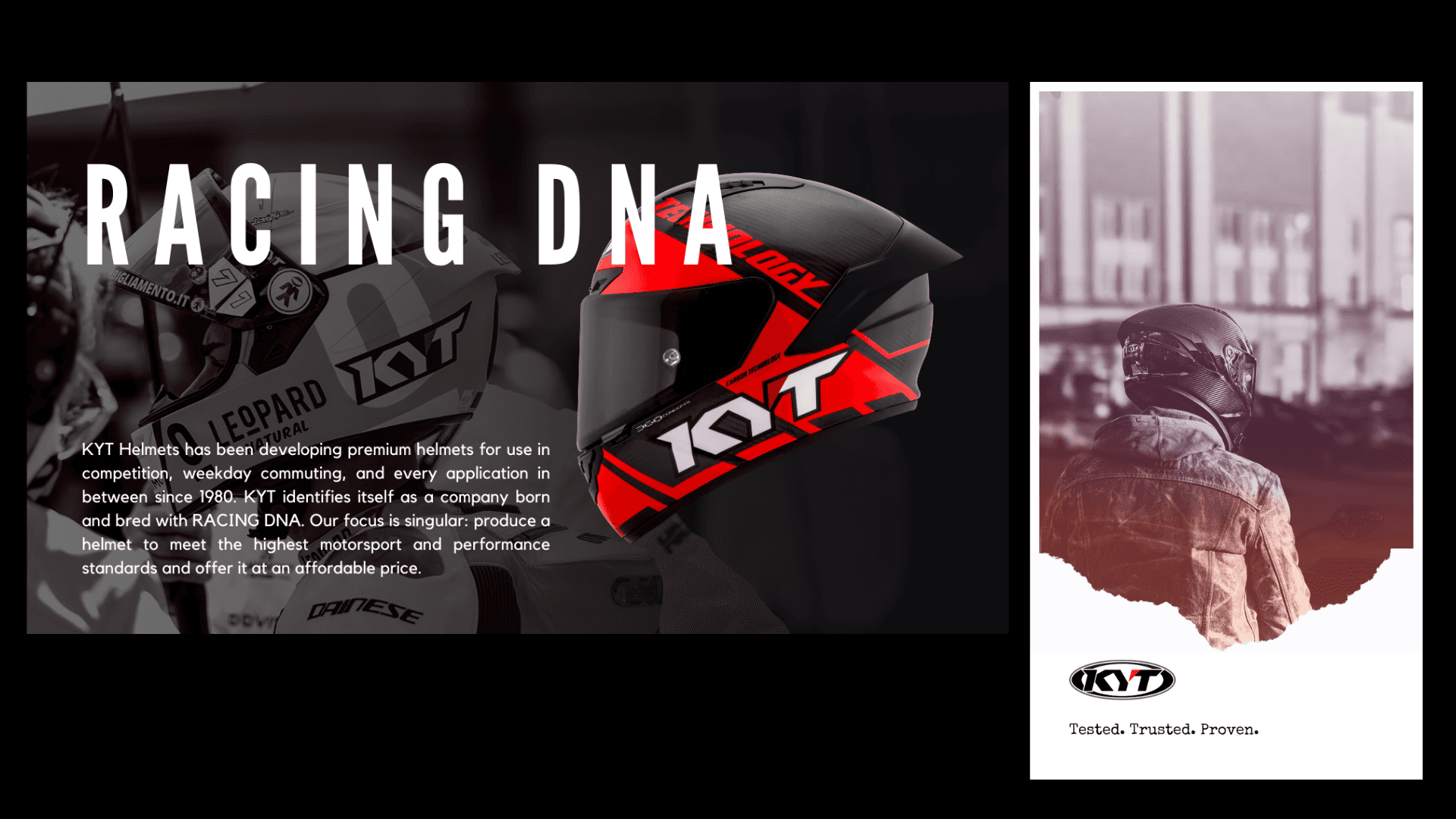 The brand platform was designed to translate KYT's existing MotoGP racing DNA into a compelling and accessible North American brand identity. The core positioning resolved the central tension: MotoGP performance, made accessible.